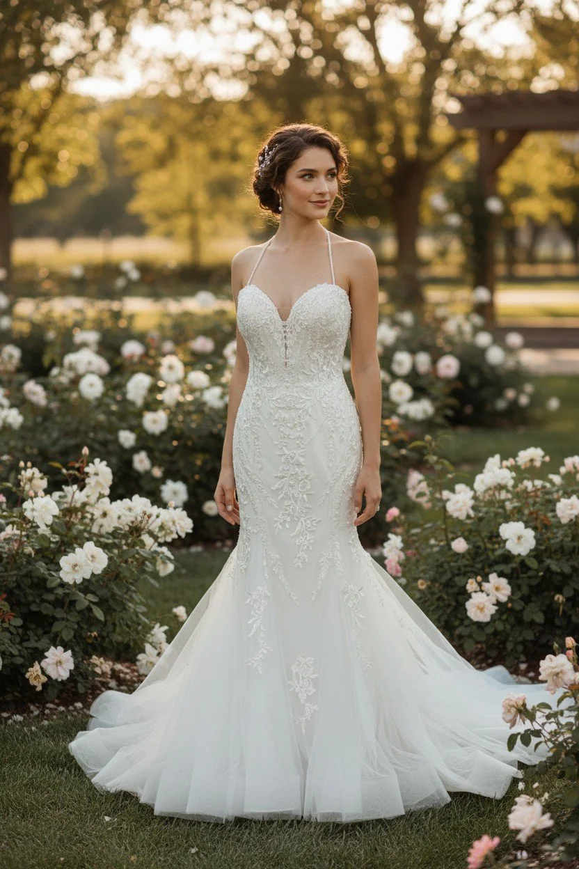 This captivating wedding gown is designed for the bride who adores sparkle, structure, and ethereal movement. Featuring a beautifully sculpted fit-and-flare silhouette, the gown highlights the figure with a flattering, inspired bodice adorned in shimmering sequins and delicate lace appliqué.