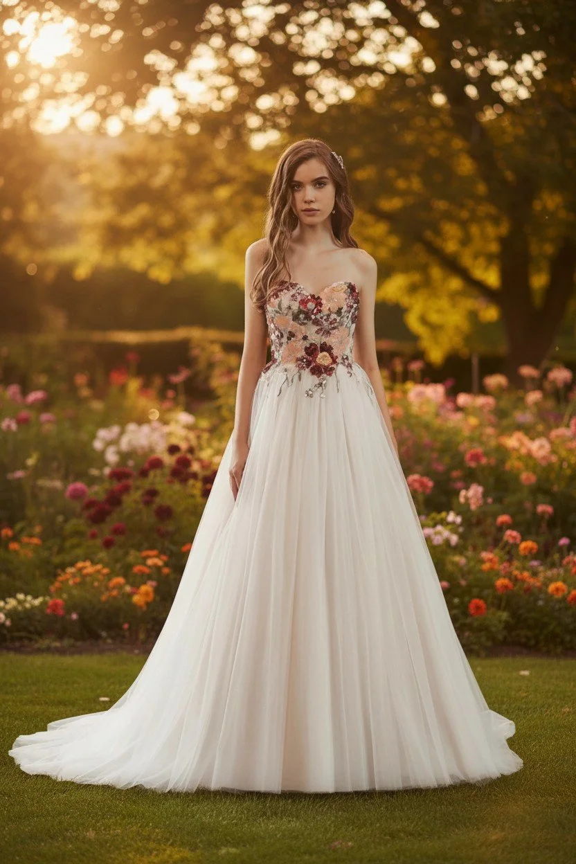 This captivating wedding gown is a true work of art, blending bold floral artistry with dreamy tulle for a look that is both whimsical and unforgettable. The strapless bodice is richly adorned with hand-sewn floral beading in warm, romantic tones—creating a stunning tapestry of shimmering petals and delicate leaves. Its sweetheart neckline enhances the feminine silhouette while offering a modern, fashion-forward edge.