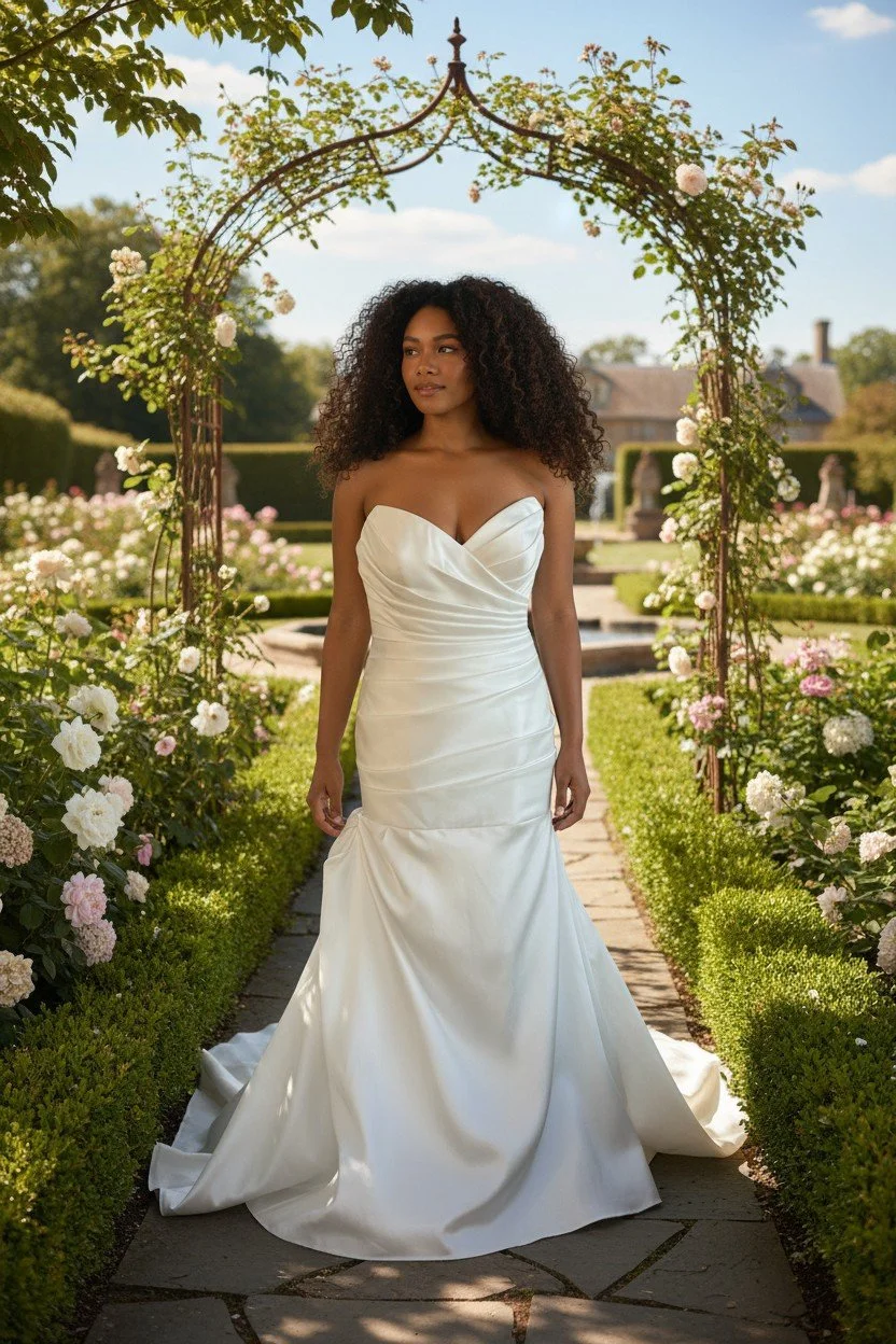 This stunning satin wedding gown embodies clean sophistication and refined glamour. The strapless sweetheart neckline features soft, asymmetrical draping that flatters the bust and adds gentle texture to the sleek silhouette. Crafted from luxurious satin, the bodice contours beautifully before flowing into a fit-and-flare skirt that enhances natural curves while maintaining an elegant, elongated look.