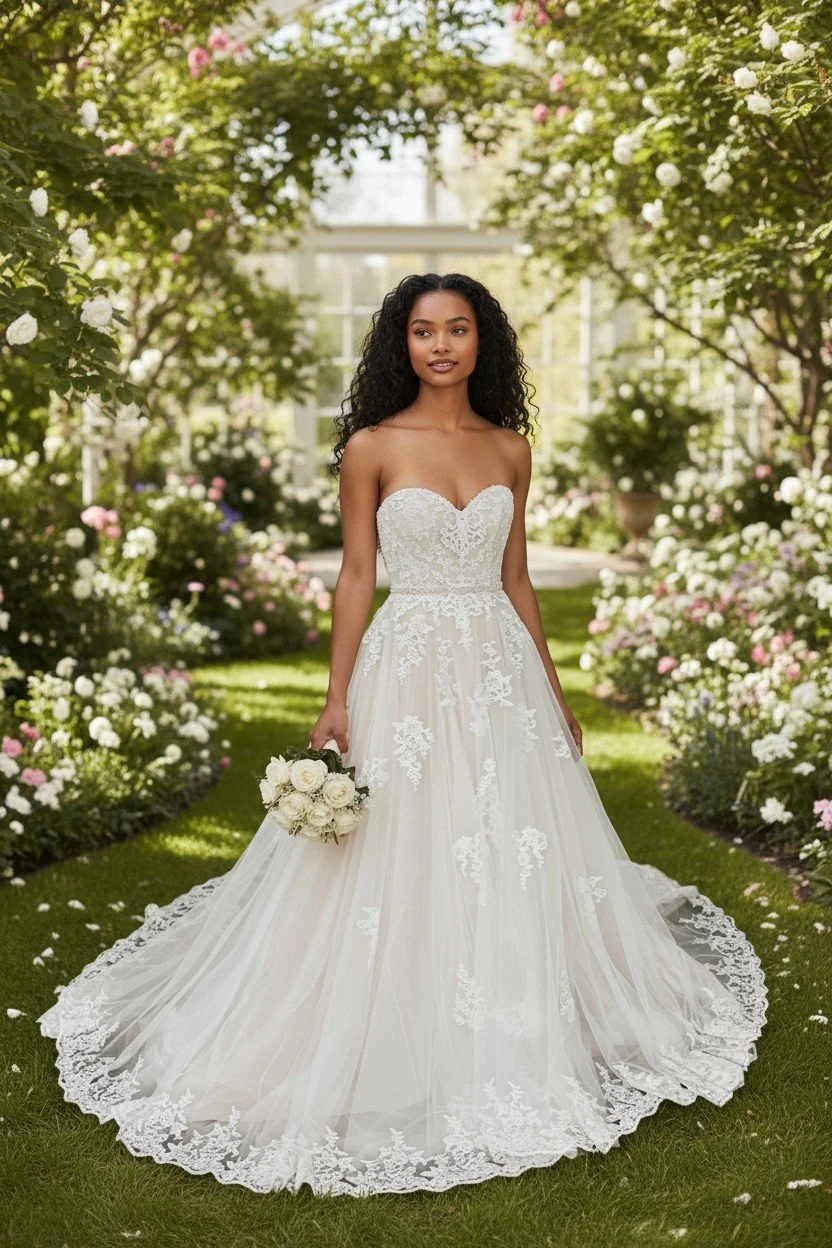 This enchanting A-line wedding gown blends timeless romance with dreamy movement. The strapless sweetheart bodice is adorned with delicate floral lace appliqué, creating soft texture and a beautifully sculpted neckline. A subtle beaded belt highlights the waist, adding just the right touch of shimmer.