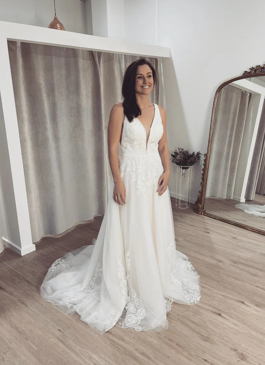 The skirt flows gently from the waist into a full, airy finish, balancing elegance with comfort and ease. Fine lace appliqué cascades seamlessly into the skirt, adding a romantic softness without overwhelming the clean lines of the design. A subtle train completes the look, offering a polished finish that feels both timeless and modern.